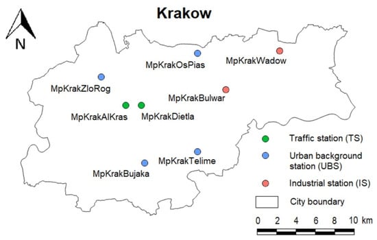 Measurement results derived from eight air quality monitoring (AQM) stations in Krakow, spanning the period 2017–2018, were applied in this study. The stations are operated by the Inspectorate for Environmental Protection (IEP) [102,103].