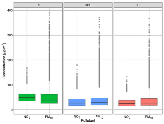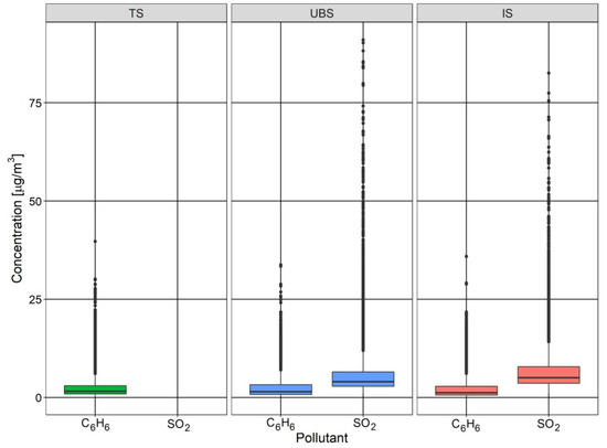 Traffic stations (TS) are characterized by the highest median values of NO2 and PM10 concentrations, compared to other station types, which is reflected in the boxplots (Figure 2). In the case of C6H6 and SO2 the median concentrations for individual types of monitoring stations are comparable to each other—there is no noticeable difference (Figure 3). It can be noted that there occur outlying points, which can be several times higher than the respective median value.
