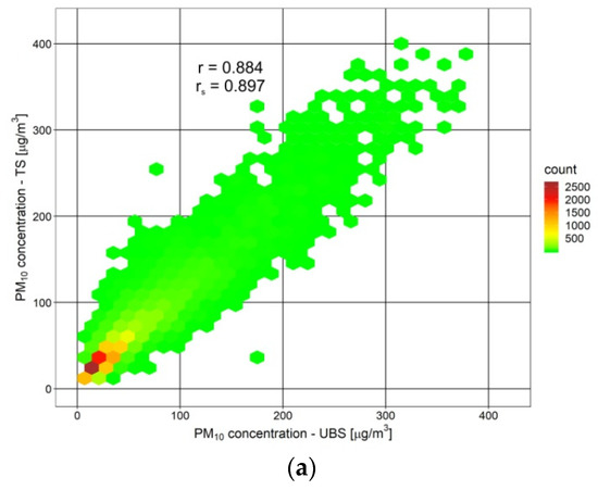 Data series of PM10, NO2, C6H6 and SO2 concentrations in the air, averaged according to the above-mentioned principles, were presented on scatter plots generated via R programming environment [104,105,106,107]. The special mode of these plots (hexagonal binning), aggregating dense groups of data points into polygons, was applied. This allowed us to not only examine relationships between variables but also to analyze the density of data points in particular part of the graph.