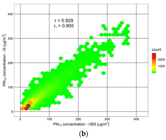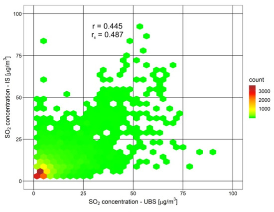 There is an observed clear linearity between a certain type of station (traffic and industrial, respectively) in relation to the values measured at urban background stations (UBS) in case of PM10 concentrations (Figure 4). The highest density of observations on the scatterplots falls on the values of 100 μg/m3 or lower. In contrast to the PM10, the relationship between NO2 concentration for traffic and urban background stations is likely to be non-linear (Figure 5). There is observed a similar pattern regarding C6H6 and SO2 concentrations (Figure 6 and Figure 7). In order to better visualize the relationships between the 1-h concentrations observed at different types of AQM stations, the Pearson correlation coefficient (r) and Spearman’s rank correlation coefficient (rs) are also presented in Figure 4, Figure 5, Figure 6 and Figure 7.