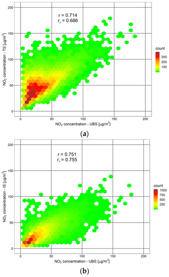 Scatterplots of average 1-h NO2 concentrations obtained for traffic (a) or industrial (b) and urban background stations in Krakow in the years 2017–2018 [µg/m3].
