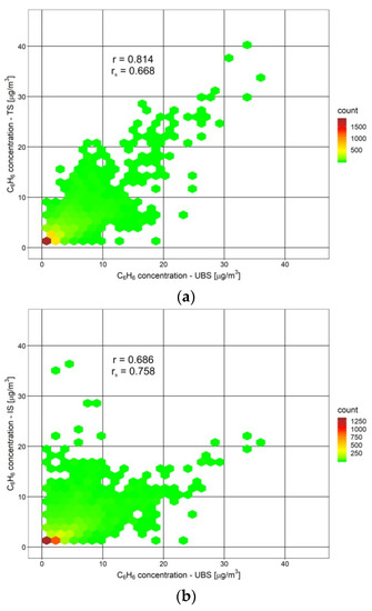 Scatterplots of average 1-h C6H6 concentrations obtained for traffic (a) or industrial (b) and urban background stations in Krakow in the years 2017–2018 [µg/m3].