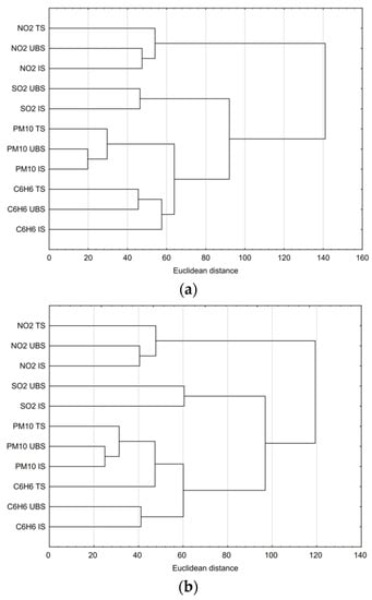 The results of performed cluster analysis are presented in Figure 8 and Table 2 and Table 3. Two variants of analysis were conducted, with and without outliers, in order to assess the effect of outliers exclusion. In both cases Euclidean distance was applied as a measure of similarity. Despite the slight differences for PM10 and C6H6, the main tendency of clustering IS and UBS together and TS separately was still present. For all substances, except benzene, this tendency is present both in the example with and without outliers. In the case of C6H6 including outliers, the TS and UBS types are clustered together and IS type is separated from them.