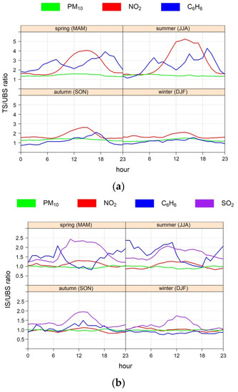 Average TS/UBS (a) and IS/UBS (b) ratios of analyzed air pollutant concentrations at AQM stations in Krakow calculated for hourly mean during each season (trimesters) of the years 2017–2018. Spring: March, April and May; summer: June, July and August; autumn: September, October and November; winter: December, January and February.