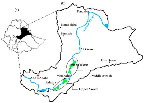Location map, Ethiopia with its major river basins (a) and Awash Basin (b) and areas where modern irrigation has started (in the Upper Awash—Wonji and Metahara Sugar Estates, Merti Nura Era, Tibila and in the Middle Awash—Amibara, Kesem Sugar Estate and Gewane Cotton farm) (modified and adapted from [10]).