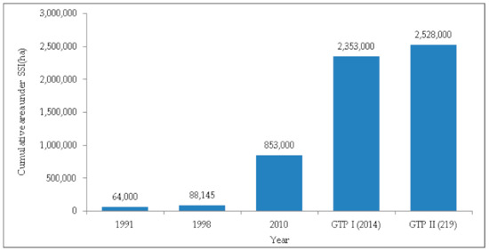 The trend of irrigation development after the downfall of the Derg regime is indicated in Figure 3. The period between 1991 and 1995 was considered as a transitional period (to federalism) during which no significant irrigation development activity was carried out. It was with the issuance and implementation of a series of national economic development plans and programs that the development of medium and large-scale irrigation showed a significant increase. Examples of these development programs and plans during that time are among others: the Sustainable Development and Poverty Reduction Program (SDPRP, from 2002/03–2004/05); Plan for Accelerated and Sustained Development to End Poverty (PASDEP, from 2005/06–2009/10); and the Growth and Transformation Plan (GTP I, from 2010/11–2014/15) and GTP II, from 2015/16–2019/20. In all these plans, irrigation development was given greater attention.