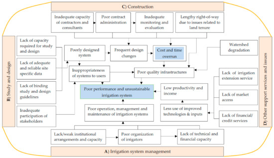 Irrigation in Ethiopia is facing multitudes of constraints in all phases of its development (project identification, feasibility study and detail design, construction, operation, and management). The major problems and resulting consequences are summarized in Figure 5. The end effects of these interconnected problems are project cost and time overrun, poor scheme performances, and unsustainable irrigation.