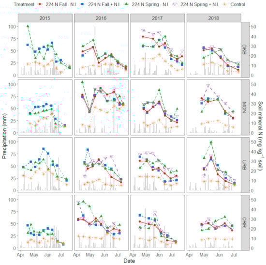 Daily precipitation (gray bars) and average soil mineral nitrogen (N) measured at research sites from 2015 to 2018. (Treatments were 224 kg N ha−1 applied as anhydrous ammonia with (+N.I.) or without (−N.I.) nitrification inhibitor, and control with zero N). Research trials were located at the University of Illinois Crop Sciences Research & Education centers near DeKalb (DKB), Monmouth (MON), Urbana (URB), and Perry (ORR), in Illinois.