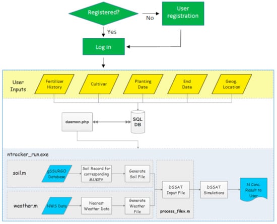 General flowchart of the online tool. Green processes: registration and log in; yellow: user inputs; blue: server downloaded and processed data; gray: server-side processing. Daemon.php: the program checks if there is a user simulation request on SQL DB; ntracker_run.exe is the main program on the server to run a simulation that includes soil.m, weather.m, process_filex.m, and output programs; soil.m prepares soil profile data for DSSAT; weather.m prepares weather data for DSSAT; process_filex.m integrates and formats weather and soil data to DSSAT input files.