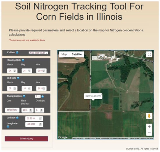 The online tool can be accessed at http://rsetserver.sws.uiuc.edu/ntrack (accessed on 16 December 2020). A user registers first (name and email address). After logging in, the user can inquire about SMN availability in real-time for their field by inputting N application (fertilizer history), crop information (growing degree days for maturity, planting date), simulation end date (default: current day), and location (latitude and longitude or by clicking on Googlemap) (Figure 3). In Illinois, because precipitation is usually sufficient, most cornfields are rainfed; therefore, the interface does not include irrigation as a management option. Each request is stored in a queue, and the online tool is ready to receive other requests. The queued requests are processed on a first-in, first-out (FIFO) basis.
