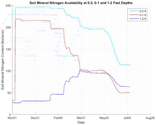 Simulation results of soil mineral nitrogen (N) content at the 0–1 (red line), 1–2 (blue line), and 0–2 feet depths (light blue solid line) (1 feet = 30.5 cm). The simulation start date was 1 November 2017, and the end date was 15 July 2018. N fertilizer was applied on 8 November 2017 at a rate of 200 lbs N acre−1 (224 kg N ha−1) at 6 inches depth (1 inch = 2.54 cm).