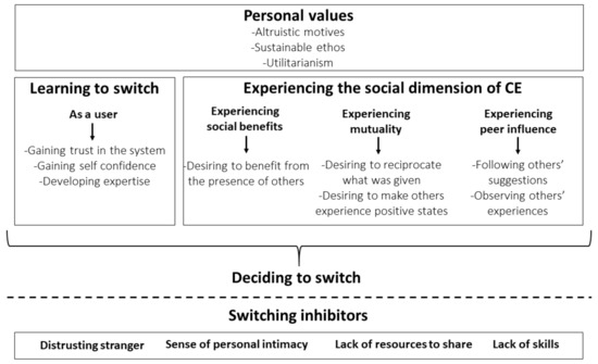 The main factors for switching from user to provider are personal values, learning to switch, and experiencing the social dimensions of the CE. Moreover, several inhibitors of switching were identified; distrust in strangers, a sense of intimacy, perceived lack of skills, and lack of resources to share. The next section details these findings. Figure 1 summarizes the themes and sub-themes that emerged from the analysis. Additional supportive verbatim quotes for each identified theme are provided in the Appendix.