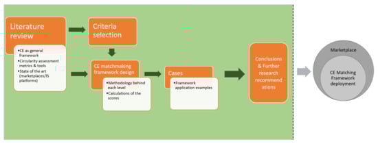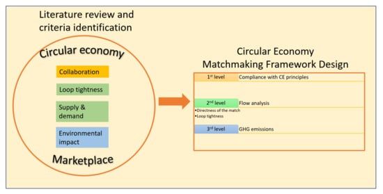 Online marketplaces facilitate the identification of supply and demand and therefore are practical tools for secondary material markets. They are seen as synergy facilitators in the context of circular economy. Existing marketplaces, though conceptually complying with CE principles, in many ways still follow the linear economy laws of supply and demand. Concepts related to circular economy such as the relational dimension, collaborations, and loop tightness, although very relevant for creating synergies in the context of marketplace and circular economy, are not taken into account. The need for advancement of those tools in the spirit of the CE arises. In order to address that challenge, a CE matchmaking framework for implementation into a marketplace algorithm is proposed. The circular economy was used as a context. Based on the literature research, several aspects for consideration in terms of circular matching and marketplace were identified, with some of them being a consequence of the marketplace’s nature (e.g., supply/demand), while others were related to the CE principles. When defining the criteria to be included in the CE matching framework, the following aspects were taken into account: collaboration as a CE enabler, loop tightness, supply and demand, and environmental impact. A multi-level approach was chosen to address all the defined aspects and to assure the flexibility of adding additional aspects in the future, if needed. The following criteria encompassing the defined aspects are proposed as a multi-level approach within the matchmaking framework: (i) compliance with CE principles, (ii) material flows with special attention to loop tightness and matches directness, (iii) GHG emissions deriving from secondary raw material transport between the stakeholders’ warehouses. The process of criteria selection is described in Figure 3.