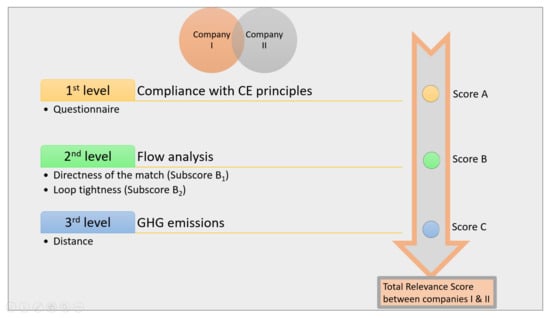 The CE matchmaking framework design is presented in Figure 4. The framework is based on a multi-level approach with following levels: (i) compliance with CE principles, (ii) flow analysis with special attention to the loop tightness and matches directness, and (iii) GHG emissions. Relevance subscores A, B, and C are obtained at every level (i), (ii), and (iii), respectively, and further transformed into the Total Relevance Score between the users based on the following equation: