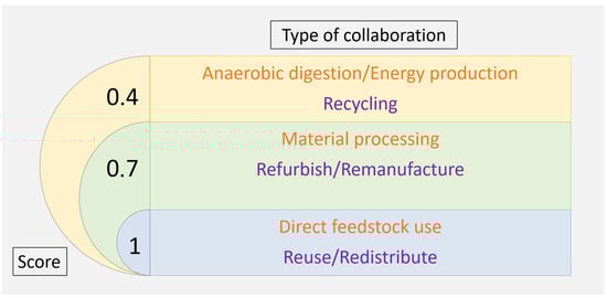 Within the developed concept, collaborations resulting in a tighter loop are promoted. This is expressed by the scoring scheme presented in Figure 5. The scoring scheme is based on the logic behind the EMF infographic [], also known as the “butterfly diagram”. The fundamentals of the CE are captured in that diagram, including the reasoning behind striving for tighter loops.