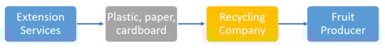 The loop tightness scoring scheme is based on the type of collaboration and involves distinction between technical and biological cycles. Although Walter Stahel’s inertia principle pertains to technical materials [] and therefore concerns mainly the technical cycle, similar logic is used for the biological cycle scores. In the biological cycle, the reasoning behind the scoring scheme is based on the idea that using feedstock, e.g., slurry as fertilizer, utilizes the material more completely than collaborations where processing of the material is needed. At the same time, the algorithm promotes collaborations based on processing of the material rather than synergies that are based on the use of the material for anaerobic digestion or energy production. This is achieved by assigning a higher score to the type of collaboration resulting in a tighter loop (e.g., reuse/redistribute—1, refurbish/remanufacture—0.7, recycling—0.4). For the biological cycle, the following scoring scheme is used, depending on the basis of collaboration: direct feedstock use—1, material processing—0.7, anaerobic digestion/energy production—0.4.