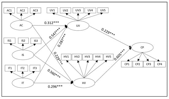 The hypothesis test results of the theoretical model are shown in Table 3. The results show that the p-values of all relationships are significant when they are less than 0.001, and the model and path coefficient are shown in Figure 3.