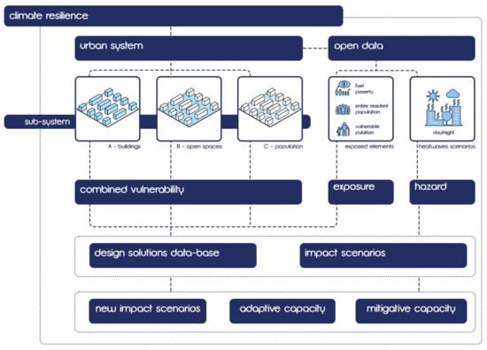 In this context, among the targets and outputs of PLANNER, the defined aim is to be able to evaluate the climatic resilience of the physical system of urban aggregates, producing results starting from certified and open access data to make available, accessible and replicable the tools, analyses, and scenario assessments on the entire national territory. The development of a model for assessing climate resilience scenarios started from the implementation of a vulnerability and climate impact assessment model already present in the literature [1] which involved the development of a database of technical and design solutions multiscalars of climate adaptation and mitigation of CO2 emissions. The design of the model for assessing climate resilience scenarios concerned, in particular, the physical subsystem of the urban system—consisting of residential buildings and open spaces—intended as minimum units affected by the interventions in the processes of planning, regeneration, and urban redevelopment, oriented to provide effective responses to climatic stress conditions. The model is designed with the aim of producing knowledge frameworks and resilience scenarios starting from open data available throughout the country. For this reason, the ISTAT (Istituto nazionale di statistica) census area [42] was identified as the minimum atomic space element at the base of the process. This process, which bases its development starting from the generation of vulnerability maps of urban physical subsystems (building subsystem and open spaces subsystem), hazard and impact scenario maps, has made it possible to obtain a process for assessing resilience levels by classifying census areas by recurrent building types and urban patterns to select optimal impact reduction actions and increase the adaptability and mitigation capacity chosen from those prepared and codified in a database of climate-proof technical alternatives (Figure 1).
