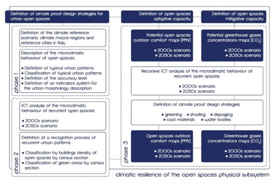 The current climate emergency poses new major challenges for cities and large metropolises, which require the development of strategies capable of reducing climate impacts and improving the adaptability of the urban system. The progressive increase in global warming causes extreme climatic events that have negative repercussions on communities [1,2]. In recent decades, the increase of the frequency and intensity of climatic phenomena, which have serious repercussions in terms of impacts on the built environment, requires the tools to support decision-making processes for the urban project aimed at climate adaptation were directed toward innovative and appropriate methodologies. Heatwaves have significant implications for humans and the environment. If we add to this the increase in their frequency, duration, and intensity, in the near future as foreseen by the IPCC—Intergovernmental Panel on Climate Change [3,4,5], it is clear that appropriate methodologies need to be developed to support the design of built urban space [6,7].