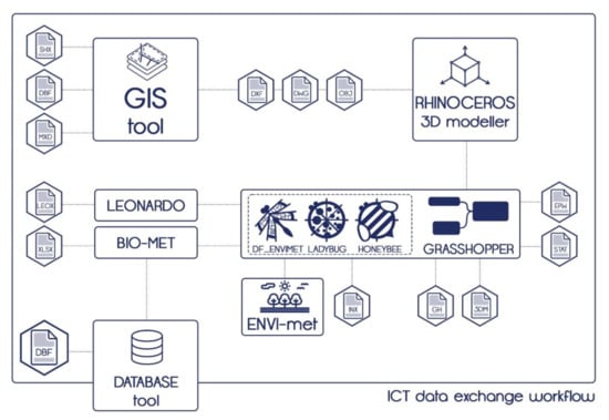 While there is a need to investigate the altering potential of local climate change action, the requirement emerges to define actions and solutions able to counteract its effects. With the introduction of simulation processes implemented with ICT (Information and Communication Technologies) environmental investigation tools [37,38], capable of operating on a neighborhood and urban block scale, it is possible to define the potential of transformation actions in response to phenomena related to climate change, transferring and verifying ideal models of climate-adaptive urban transformation [39], also through recursive testing operations. These data exchanges, now simplified by dedicated ICT tools, have introduced approaches and methodologies able of integrating data with different levels of definition and information and, at the same time, performing specialized simulation, obtainable only through dedicated software and tools [40,41].