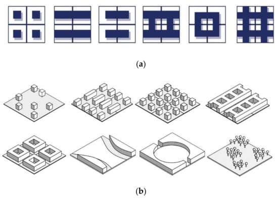 Generic urban patterns: (a) from right to left: pavilions, slabs, terraces, terrace-courts, pavilion-courts and courts. [46]; (b) deduced generic urban patterns for Italian cities [45,46].