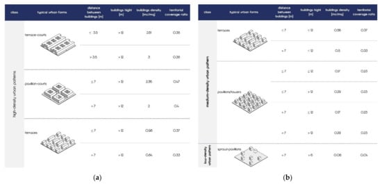 The choice to adopt models of recurrent urban patterns as descriptors of the urban morphology of the Italian cities considered is finalized to limit the complexity of urban patterns in the reality and to be able to analyze and subsequently compare the environmental impacts on the different types of geometry and urban morphology among the increase in urban temperatures and the phenomenon of heatwaves. For this classification, it has been hypothesized to use urban patterns that consider the archetypes of urban patterns (Figure 4), to be able to construct geometric models representative of the different urban morphologies based on dimensional ratios [62,63] typically described and presented within the chosen representative cities.