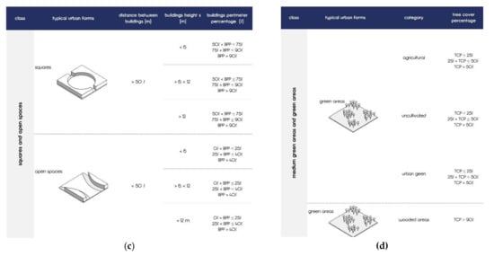 Classification of urban patterns: (a) high-density urban patterns; (b) medium and low-density urban patterns; (c) squares and open spaces; (d) medium green areas and green areas.