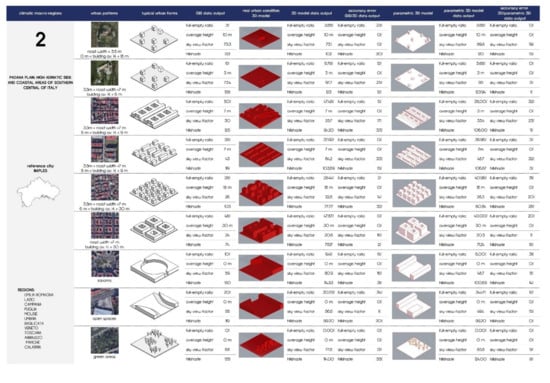 The need to verify the accuracy between the different simulation processes has guided the study toward the definition of operations to compare environmental and microclimatic performance between real urban patterns of Italian cities and typical urban patterns through testing and verification operations of data exchange between GIS-based tools and tools for parametric design. This operation led to the construction of a set of indicators capable of describing and parameterizing the complexity of the urban morphology of the reference cities. These indicators were chosen within the GIS processes already used in the earlier phases of the project for the determination of the climate vulnerability model of the physical system [1,71,72], such as: