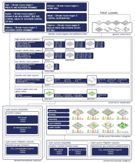 The objective is the development of a recursive and replicable process at a national level that will allow obtaining, starting from recalculation operations, both maps relating to new impact scenarios outcome of the application of technical alternatives, and adaptation cards capable of expressing levels of indoor and outdoor comfort achievable, as well as maps on mitigation capacity expressed with CO2 emission levels and concentrations. The process, which allows to automatically select, based on the building type and the recurring urban pattern, the optimal climate-proof technical solutions to be applied to residential buildings and open spaces included within the census section, is an effective tool of meta-design capable of carrying out an initial assessment on the adequacy of adaptation and climate mitigation interventions in the different climatic contexts within the Italian national territory. At the same time, the oriented meta-design process aims to develop processes for the evaluation of the actual feasibility, replicability, and effectiveness in the application of climate-proof intervention categories to the urban scale.