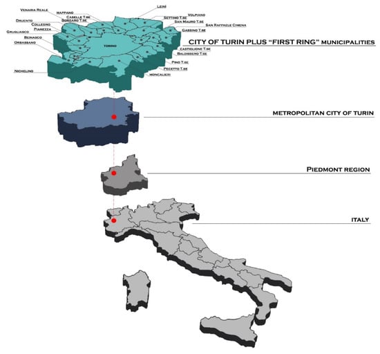 The catchment area includes 21 municipalities that border the city of Turin (Figure 1), defined as the “first ring” due to their strong interaction with the main city, namely, Baldissero Torinese, Beinasco, Borgaro Torinese, Caselle Torinese, Castiglione Torinese, Collegno, Druento, Gassino Torinese, Grugliasco, Leinì, Mappano, Moncalieri, Nichelino, Orbassano, Pecetto Torinese, Pianezza, Pino Torinese, San Mauro Torinese, San Raffaele Cimena, Settimo Torinese, Torino, Venaria Reale, and Volpiano. Despite the high administrative fragmentation, the city of Turin consists physically of a unique semi-dense continuous built-up system that from the core area shapes the surrounding zones while comprising a heterogeneous land use [37]. The average daily temperature varies from below 1.4 °C in January to 23.6 °C recorded in July, the climate is warm and temperate with significant rainfall throughout the year (about 864 mm of annual precipitation), and the driest month is January, with 38 mm, while May is the wettest month, with an average of 108 mm (https://en.climate-data.org/ accessed on 16 September 2020).