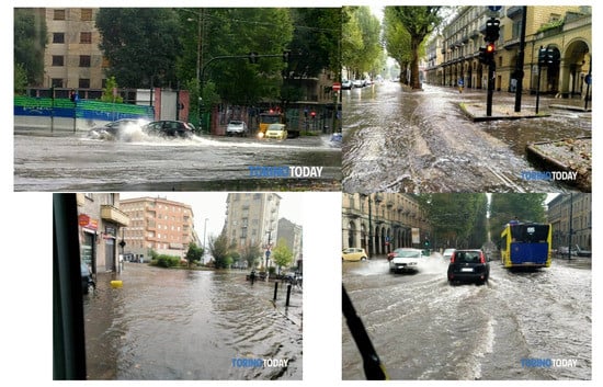 The most recent event was on 17 August 2020, when more than 70 mm of rainfall fell in less than one hour, flooding the city at several sites while creating damage to infrastructures and a sewage system black-out causing dangerous situations (Figure 2). Two metro stations were partially inundated, while for two consecutive days, the streets, canals, and sewage system were temporarily inoperative due to the high quantity of debris that flowed into the city, especially along the Po River and the hill (see local-newspaper-reported photos and videos, e.g., TorinoToday https://www.torinotoday.it/meteo/maltempo-temporale-strade-fiumi-17-agosto.html accessed on 3 October 2020).