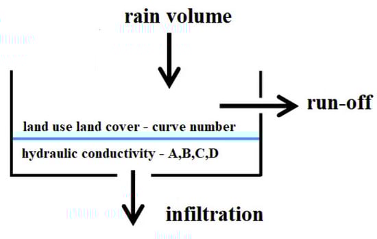 The model aims to verify the capacity of urban catchments to limit the run-off process, avoiding potential urban flooding by a cloudburst. It assumes that flood-prone areas are those where a coupled interaction between the kind of permeable/impermeable materials of artificial surfaces (e.g., urban areas) and the quantity of soil drainage (depending on water conductivity) generates the amount of water that accumulates by surface run-off during a cloudburst, resulting in temporary flooding. The model simplifies the process of run-off discharge by considering that the water on the impervious surface moves directly to the area next to it, contributing directly to a surface flow accumulation. Nevertheless, in dense urban catchments, the building roofs, terraces, and other horizontal or vertical surfaces that capture the rainwater do not directly contribute to the soil run-off. Instead, the water is temporarily withheld in various paths (e.g., water pipes of the rainwater sewer system) and contributes to the total discharge sometime later. Specific literature on this dynamic demonstrates how the biophysical quantification of the run-off in the built environment exposed to torrential hazards can be significantly difficult to estimate [20], since the quantity, quality, and surface of buildings, the sewer systems, the presence of dust in the ground, and the dryness of the soil can affect the discharge volume during cloudburst [11,38].