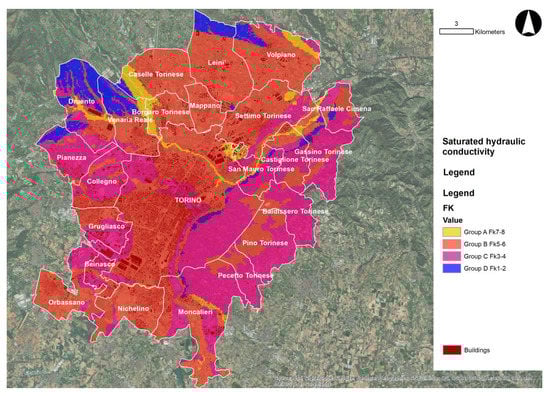 The result is presented in Figure 4, where it can be noted how the dense built-up system of the city of Turin stands on a Group B soil, which is a good one (medium-high conductivity) while the hill (eastern part) is rooted in Groups C and D, resulting in its being extremely vulnerable to rainfall events.