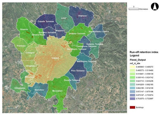 Table 4 calculated the run-off index (%) as the total volume of rainfall in each municipality less the fraction that is retained (Table 3). The city of Turin reaches 52% of the run-off index. This means that 52% of the rainfall volume cannot be retained by soil, thus creating a pluvial surface stream. Therefore, more than half of the total rain volume is subject to run-off in the city, generating severe problems in terms of human safety, hydraulic safety, and water management, in addition to all the indirect effects that these phenomena may entail (e.g., congestion of the water and sewer network). The total volume of the run-off discharge is 3.4 million cubic meters, which is a huge amount, considering that the relative run-off per hectare ranges from 230 to 430 cu.m. per hectare.