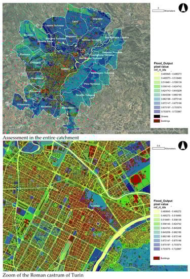 As already mentioned, the results can support the determination of strategies to reduce and prevent flooding events. The results can also address decision-making by suggesting solutions to mainstream the resilience of territories in their planning, and ensuring that those solutions are practicable. In the following chapters, the integration of the flooding vulnerability assessment has been investigated for the city of Turin. The latest City Planning Technical Document (2020) describes the general vulnerability of the city to hydrological hazards. However, quantitative data provides no evidence of the spatial distribution at the district level, and the real discharge capacity of the city of Turin during a single rain event is not known at the moment. Even the preliminary document of the Strategic Environmental Assessment (SEA) does not contain any proper assessment of soil infiltration capacity at the city level; thus, it is not known whether the city is vulnerable to rain events and, if so, at which threshold the city experiences a potential flood event. Therefore, a comparison between the quantity of estimated run-off by the InVEST Urban Flood Model (3.4 million cubic meters) and the real discharge capacity of the stormwater drainage system cannot be appropriately made (maybe only estimated).