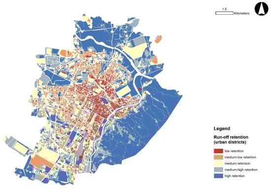 The analysis of the run-off retention at the district level has been spatially distributed using the mean retention value for each urban feature of the city.