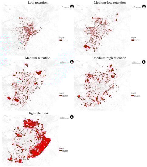 The functional zoning of the Turin general town plan has been superimposed on the flooding vulnerability output for identifying the distribution of critical run-off thresholds and classifying the retention capacity according to the main functional destination (e.g., residential, commercial, tertiary, or public facilities). This operation supported the selection of NBS, also considering the context of their implementation. Five classes were identified in the city of Turin (Figure 7 and Figure 8): from low retention capacity (highly sealed/low conductivity areas) to high retention capacity (unsealed/high conductivity areas).