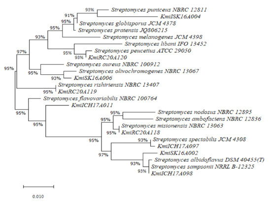 Strains were inoculated on ISP-2 agar and incubated at 28 ± 2 °C. The DNA was extracted from 24-h-old actinobacterial culture. Approximately 50 mg of actinobacterial culture was placed in 200 µL of PrepMan solution (Life Technologies, CA, USA) and homogenised with glass beads in a BeadBug homogeniser (Benchmark scientific, NJ, USA). Subsequently, 1 µl of the supernatant was used in the PCR (Polymerase Chain Reaction) reaction. The 16S rRNA gene of the DNA was amplified by using the forward primer 27 F (5′-AGAGTTTGATCCTGGCTCAG-3′) and the reverse primer 1492R (5′-TACGGTTACCTTGTTACGACTT-3′) [21]. Thirty microliters of the PCR mixture contained 3 µL of 10x Dream Taq DNA buffer, 3 µL of 2 mM dNTP mix, 1 µL of MgCl2, 1.2 µL each of the opposing amplification primers (10 mM), 0.1 µL Dream Taq DNA polymerase, and 1 µL of genomic DNA. The PCR amplification was performed in a thermal-cycler MJ Mini (Biorad, CA, USA) programmed for an initial cycle at 95 °C for 3 min, followed by 40 cycles at 95 °C for 30 s, 56 °C for 30 s, 72 °C for 90 s, followed by a final extension at 72 °C for 10 min. The PCR-amplified 16S rDNA was checked in agarose gel. Products were purified by enzymatic treatment using the ExoI/FastAP mixture (ThermoFisher, MA USA) and sequenced by the MacroGen Company, South Korea. The similarity and homology of the 16S rRNA partial gene sequence were compared with available sequences by the BLAST search against the GenBank (www.genbank.com, accessed 15 April 2021) 16S rRNA gene database, limited to type strains [22]. The DNA sequences were aligned, and the phylogenetic tree was constructed using the maximum likelihood algorithm. A bootstrap analysis of 1000 replicates was carried out using Molecular Evolutionary Genetics Analysis (MEGA) 6.06 [23].