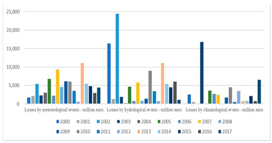 According to data published by Eurostat [11], meteorological events caused significant losses, especially in 2007, while in 2002, there were the largest losses caused by hydrological events. Of the entire analyzed period (2000–2017), the year 2003 brought the largest losses caused by climatic events (Figure 2).