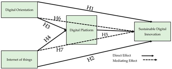 IoT brings benefits for both businesses and individuals in the form of developing the connections with the latest technology and its applications with the continuous innovation []. Similarly, the creation of the digital platform majorly depends on IoT. This research argues that the digital platforms meditate the IoT and sustainable digital innovation link. Different firms and organizations are taking advantage of IoT for achieving the digital platforms through the latest technology and advanced means of communication []. These digital platforms help to collect relevant data, information and knowledge to increase the efficiency of all functions of businesses for achieving the digital innovation []. The IoT has offered a wide variety of platforms that are present online to perform various functions of the business related to the digital innovation. These digital platforms are helping the businesses to gather the information for bringing the sustainable innovation. These platforms have also offered a wide range of innovative models for doing business in a sustainable way. By offering a wide range of business digital platform opportunities, IoT is deriving sustainable innovation into the business. By linking the IoT for bringing the sustainable digital innovation, the digital platforms may represent a strong connection bridge [,]. Therefore, based on it, the following hypothesis is derived:
