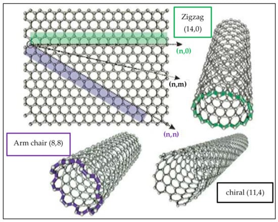 Based on the chemistry, there are two zones of CNTs: the sidewall and tip. A significant aspect in controlling these distinctive properties emanates after the change in the tube-like structure due to entrapment of graphene layers into a cylindrical shape. Figure 2 shows different structures of rolled SWCNTs based on graphene sheets. Depending on alignment of the cylinder axis relative to the hexagonal matrix, the CNTs structure can be stipulated by chiral carrier in three ways, armchair, chiral, and zigzag, illustrated by their chirality index (n,m). Geometric arrangement of carbon atoms present at the layer of nanotubes is responsible for the foundation of zigzag (m = 0) and armchair (n = m) CNTs, whereas the structure of the nanotube with the two enantiomorphs on the right side is chiral (n ≠ m) [53,54].