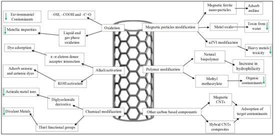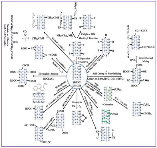 The non-polar nature of graphene layers makes the CNTs naturally hydrophobic. The hydrophobic property of CNTs is indispensable for the adsorption of aromatic contaminants like benzene and anthracene. A very strong complexion is formed due to π electrons present on the graphene layer making CNTs, between aromatic contaminants and the tube surface [132]. The surface affinity of CNTs can be modulated to a variety of contaminants in water and wastewater after the purification and surface functionalization. Higher adsorption of benzene was obtained by using CNTs as compared to activated carbon (AC) because of strong interaction between benzene rings and the surface of CNTs due its hydrophobicity [133]. Figure 3 shows the different routes and schemes of CNT functionalization to increase their affinity for water and wastewater contaminates, which can be subsequently captured on the surface of CNTs used. Moreover, the functionalization of CNTs can be divided into three categories, shown in Figure 4 [134]: