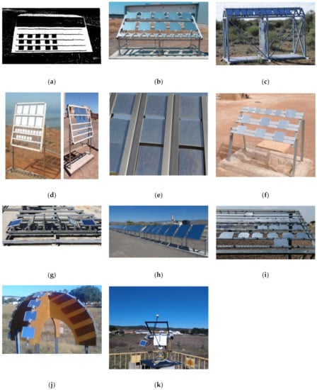 Concentrating solar power reflector testbeds: (a) Sandia national laboratories, Albuquerque, NM [1]; (b) Plataforma Solar de Almería (PSA) Tabernas, Almería, Spain [6]; (c) the semi-arid southern Kalahari region in Northern Cape, South Africa [27]; (d) left is Temara Oceanside site and right is the Skoura desert site in Morocco [28]; (e) Southwest Morocco [29]; (f) University of Oujda in Eastern Morocco [10]; (g) Gardens Point campus, Brisbane, Australia [30]; (h) PSA in Tabernas, Almería, Spain [23]; (i) Benguerir, Morocco [14]; (j) Portugal on an experimental site (Valverde) of the University of Évora [26]; (k) in a rural region of Évora, Alentejo, Portugal [31].