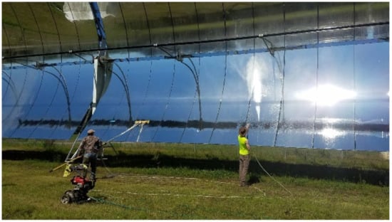 In a previous study in southern Louisiana, measurements taken of the specular reflectance showed that after having been reduced to less than 80%, washing the reflectors returned them to original performance specifications for reflectivity >95% [16]. The washing procedure currently employed at the Louisiana CSP plant involves using a pressure washer with deionized water and a microfiber cloth attached to a pole brush designed by 3M (Figure 2). This brush consists of a long pole attached to a brush head that clamps the microfiber cloth down on a sponge that has running water flowing to it to reduce surface friction. The reflector-washing procedure consists of an initial spray of water with a pressure washer, followed by wiping with the brush before the reflectors are sprayed again.