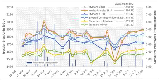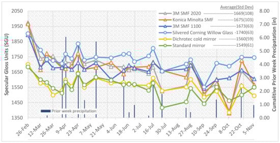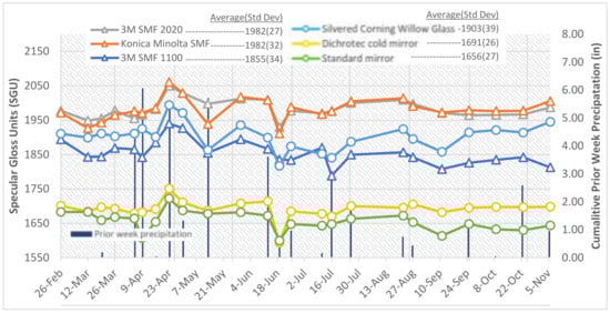 Two of the glass-type reflectors tested, the dichrotec cold mirror and the standard mirror, gave the fewest SGU readings on average throughout this study. However, they were also the least affected by soiling compared with all the other reflectors; with the standard mirror having the least SL average (6.7%). The SR was found to be lowest in the silvered Corning Willow Glass and standard mirror, and it was highest in the Konica Minolta SMF and 3M SMF 2020 (Table 2). After initial soiling, the loss of cleanliness slowed down and even showed an increase in two of the months, possibly due to the frequency of precipitation events. The highest average percentage of SL for all reflectors throughout this study was 19%, which occurred on October 9, and, if this study continued, this number would keep increasing, following the trend in Figure 13. The prewashed reflector panels SGU decreased during the year, demonstrating a gradual increase in soiling. The trend of the average of the dirty panels continually showed less gloss throughout the year. Even though there were frequent rain events in semi-tropical regions, such as south Louisiana, such rain events were not sufficient to clean the reflectors tested.