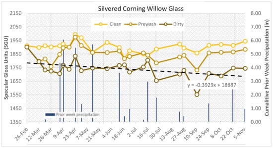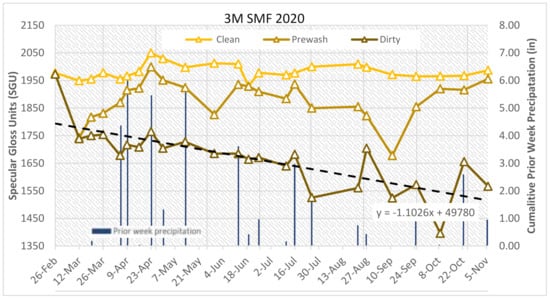 The measured SGU ranged from approximately 1350 to 2150 throughout this study. The raw SGU measurements for the panels that were not cleaned throughout this study, referred to as dirty, are shown in Figure 5. These panels were only cleaned by natural precipitation events. The prior week precipitation total is shown and correlates with dips in the SGU after little to no precipitation events, such as 11 September and 9 October. After precipitation events, SGU increases are shown in several tests, such as on 9 April, 23 April, 16 July, 25 September, and 23 October. In an analysis of 20 soiling stations in the US, it was found that no cleaning effect occurred following rain events of 0.012 inches or less; therefore, anything below 0.012 inches is considered negligible and is not counted in the cumulative prior week’s precipitation [39].