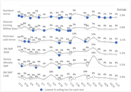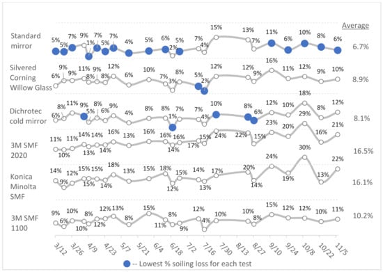 The cumulative SL percentage of the dirty compared with the clean panels is shown in Figure 9 below. The Konica Minolta and 3M 2020 demonstrated the highest losses from soiling. Although the dichrotec and standard mirrors showed consistently fewer SGU readings than other reflectors (Figure 5 above), they were less affected by soiling throughout the year. Furthermore, during high precipitation events, such as April 9 and June 18 as seen in Figure 9, the mirrors were cleaned more efficiently than other reflectors with less than 5% SLs following the precipitation events. As shown with the blue dots, the standard mirror demonstrated the lowest percent SL for 70% of the tests with an average of 6.7% throughout this study. This equates to 2.5-fold less SL than the 3M SMF 2020, which showed the highest average SL at 16.5%. The silvered Corning Willow Glass gave an average SL of 8.9% throughout this study, which is considerably less than the thin-films tested. The most significant average SL of all reflectors occurred on 9 October when there had been virtually no precipitation events for 18 days.