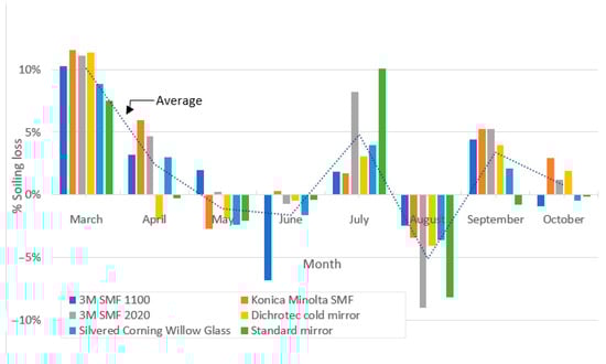 Cumulative percentage of soiling loss in the dirty (natural cleaning only) reflectors.