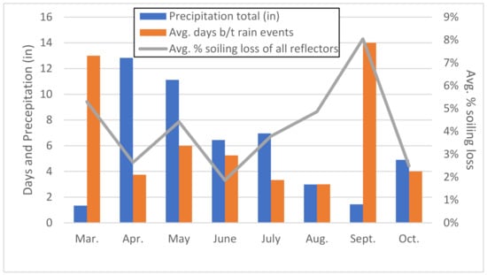 Monthly average % soiling loss of all reflectors compared with precipitation and days between rain events.