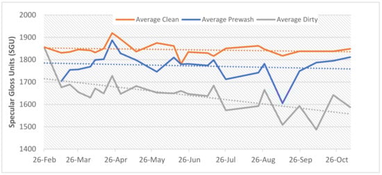 An average of all panels was taken to see the overall trend of the SGU measurements throughout this study as shown in Figure 13. The average clean reflectors stayed consistent with a linear slope of −0.0356. The average prewash reflectors showed more of a decline throughout the testing period with a linear slope of −0.31. Despite heavy precipitation events, the dirty reflectors have a gradually lower linear trend with a slope of −0.79.
